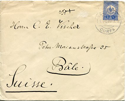 Ottoman Turkey: 1912 (1 November). Cover to Switzerland franked 1pi of 1909 Tughra issue tied by URFA – OURFA (vilayet Halep, A&P type 5) datestamp. Reverse 16 November Basel arrival cds.