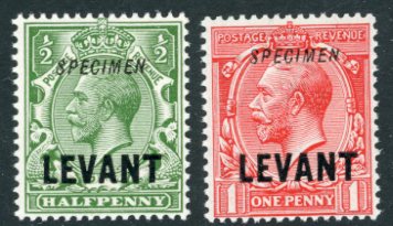 British Levant: 1913 (July). KGV stamps overprinted LEVANT unmounted mint 1/2d. green and 1d. scarlet overprinted SPECIMEN type 23. Less than a single pane of 120 released by The British Postal Museum & Archive. Sg. L16s/L17s **