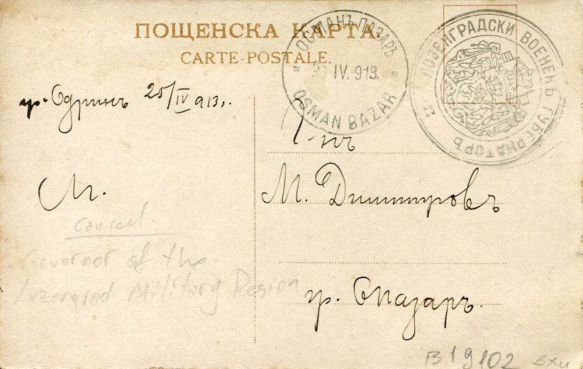 Bulgaria: 1913 (30 April). Soldier mail free from franking postcard of the Ottoman prisoners and the Bulgarian commander General Mihail Savov at Stara Zagora to Sofia struck on reverse bilingual OSMAN BAZAR (today Omurtag) datestamp and Governor of the Lozengrad (today Kirklareli, Turkey) Military Region handstamp.