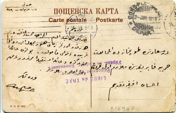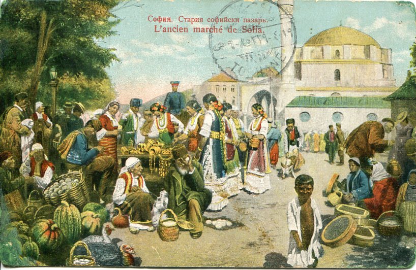 Bulgaria: 1913 (14 June). Watercolour postcard titled ‘L’ancien marche de Sofia’ from a Balkan War Ottoman prisoners of war to Istanbul struck by Sofia datestamp, Cons-Ple -Depart transit and on front 2 July Tophane arrival cds’s and bi-lingual LIBRE de TAXE / Prisonnier de Guerre violet handcachet.