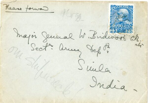 Egypt: 1913 (November). Cover to India carried on Express Line Trieste – Alexandria abd posted aboard the S.S. WIEN, forwarded from Port Said and is addressed to General William Birdwood who later commanded Anzac Divisions at Gallipoli in 1915 accompanying reproduction photo of the ship at Venice. SS Wien sunk in 1941 under an Italian flag. Reverse 30 November Secreteriat arrival cds.