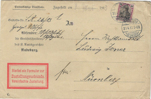Germany: 1913 (30.4.) printed Post Office envelope enclosing advice of delivery bearing single franking 50pf. peace time Germania tied Radeburg cds, addressed to Nurnberg.