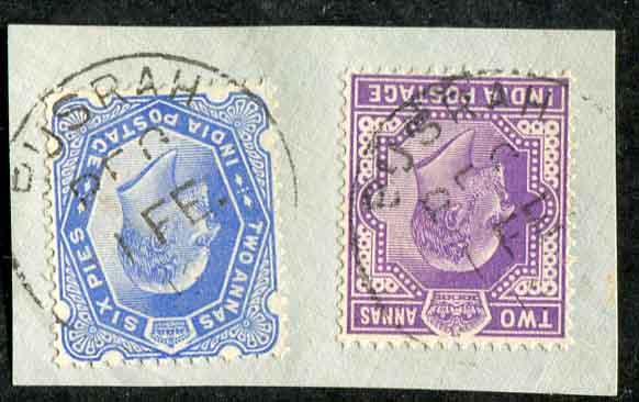 Iraq: 1913 (1 February). India Used Abroad 2a. violet and 2a.6p. ultramarine on piece cancelled by SG type Z7 BUSRAH REG. date stamps. Sg. Z162, Z163