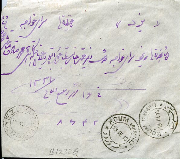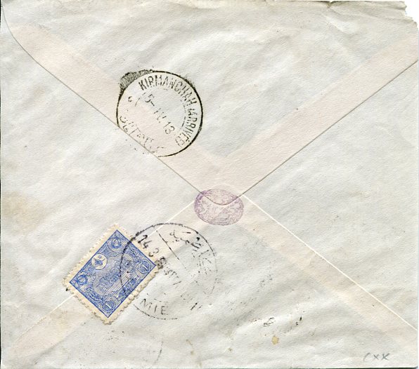 Ottoman Iraq: 1913 (14 March). Cover to Iran franked with 1pi of 1913 New Post Office stamp tied by KAZIMIYE – KIAZIMIE (vilayet Baghdad, A&P type 1, RR) datestamp, 5 April Kirmanchah and 7 April Yezd transit and on reverse 19 April Koum arrival cds’s.