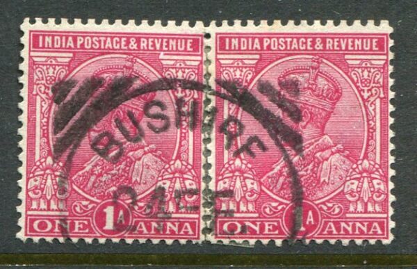 India Used Abroad – Iran: 1913 India pair of 1a KGV struck by large part BUSHIRE datestamp. Sg. Z176