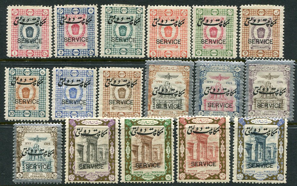 Iran: 1915 (April). Coronation of Shah Ahmed Qajar SERVICE overprinted mint o.g. reprint set of 17. *