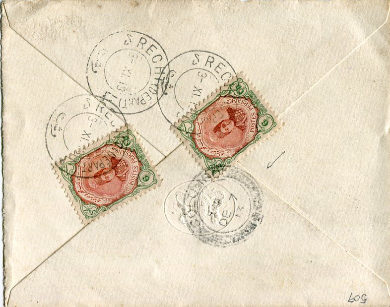 Iran: 1913 (3 November). Cover front to Ceylon franked with two 6ch Ahmed Mirza portrait and tied by Recht datestamps and 7 December Colombo arrival cds. Scarce destination.