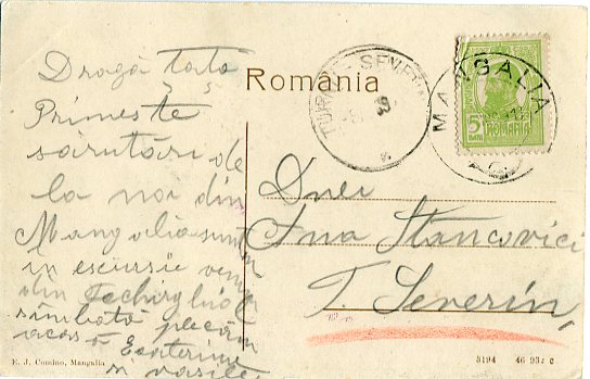 Romania: 1913 postcard titled ‘Vederea Geamiei-Mangalia’ (ed. E.J. Comino) to Turnu Severin franked with 5b and tied by Mangalia datestamp and arrival cds.