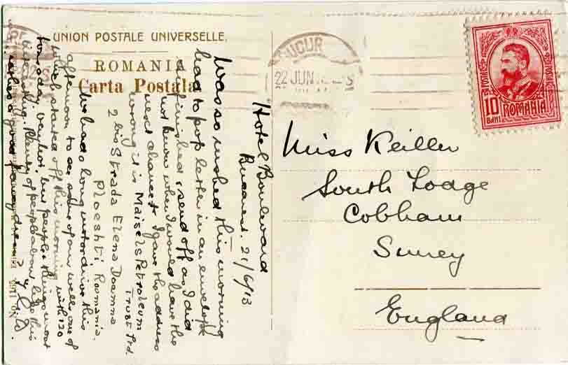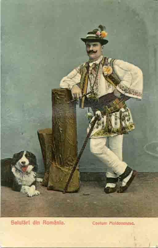 Romania: 1913 (22 June). Colour postcard titled Costum Moldovenesc. Salutari din Romania franked on reverse with 10b and tied by Bucuresti date stamp to England.