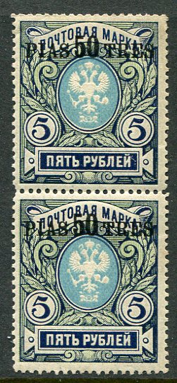 Russian Levant: 1913 (5 August). Stamps of Russia surcharged by Turkish Currency 50pi on 10r unmounted mint vertical pair. Sg. 202. **