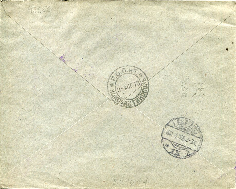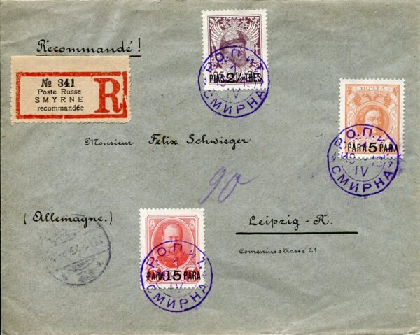 Russian Levant: 1913 (1 April). Registered cover to Germany franked with 5pa on 1k, 15pa on 3k and 2 1/2pi on 25k Turkish currency surcharged Russian Romanov stamps tied by ROPIT Smyrna datestamps. Reverse 3 April ROPIT Konstantinopel transit and Leipzig arrival cds’s. Sg. 186, 188, 193