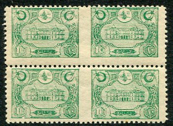Ottoman Empire: 1913 (14 March). New General Post Office, Constantinople definitive stamps 10pa green unmounted mint block of four with imperf between error. Sg. 335a