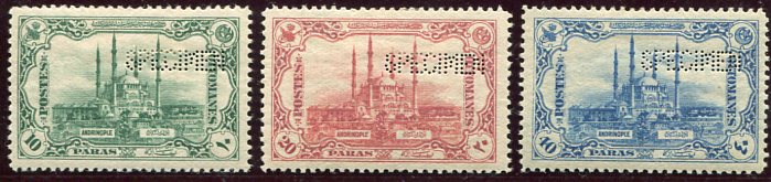 Türkiye: 1913 (23 October). Recapture of Adrianople Edirne Selimiye Mosque design commemorative issue mint o.g. set perforated SPECIMEN (type B1) by Bradbury, Wilkinson. Sg. 355/355 *