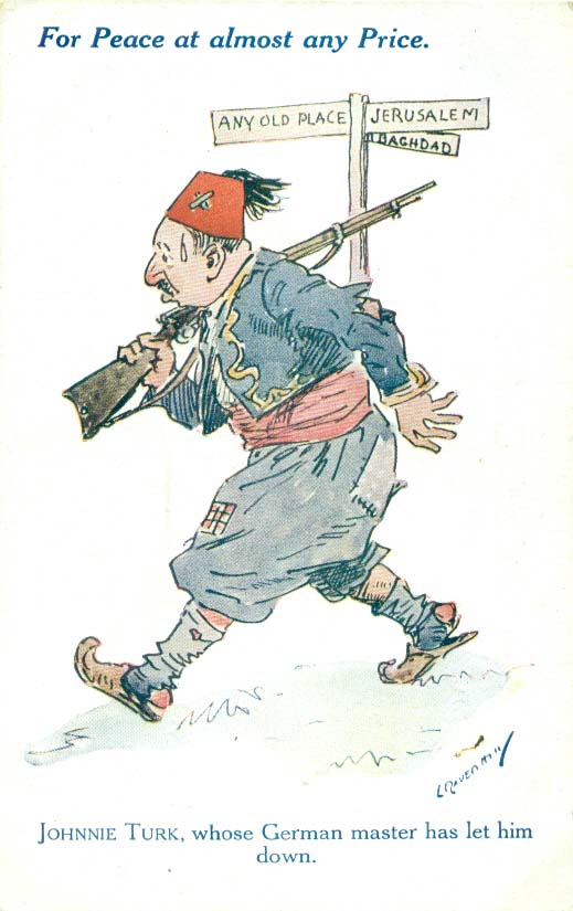 Unused 1914-1918 propaganda postcard titled ‘For Peace at almost any Price – JOHHNIE TURK, whose German master has let him down’.