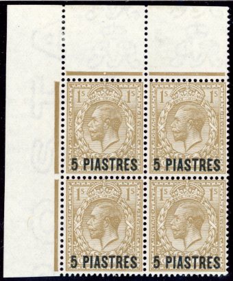 British Levant: 1914 (January). KGV stamps surcharged in Turkish currency 5pi. on 1s. bistre brown unmounted mint block of 4. Dot above Row 1/1. Official plate 1. Sg. 40 **