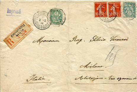 French Levant: 1914 (2 February). Registered cover to Italy franked with two 5c and two 10c French stamps tied by CONSTANTINOPLE-GALATA * POSTE FRANCH.SE datestamps. Reverse 6 February Milano arrival cds’s. Cover flaps repaired.