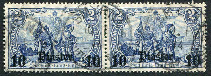 German Levant: Post offices in the Turkish Empire, stamps of Germany surcharged with Turkish currency pair of 10pi on 2m Germania with watermark struck with 10 January 1914 SMYRNE b DEUTSCHE POST Izmir, Turkey datestamps. Sg. 56