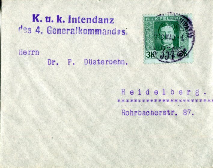 Austro-Hungary Military Post: 1918 (14 May). Cover to Heidelberg franked with 3k Charles I portrait tied by Tabori Postahivatal 354 feldpost datestamp and two lines K.u.K. Intendanz / des 4. Generalkommandes handstamp. Reverse blank.