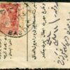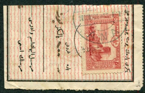 Ottoman Iraq: 1915 (10 March). Part of postal bond for 100 piastres franked with 20pa of 1914 pictorial and tied by ANA (vilayet Baghdad, A&P type 1, IRQ 13) bi-lingual datestamp. Reverse franked with 20pa and tied by 29 June 1915 Baghdad 3 datestamp when the money collected. It is very unusual to have a further franking on postal bonds. It must have been forwarded to a different post office since the manuscript on reverse reads Baghdad Telegraph.