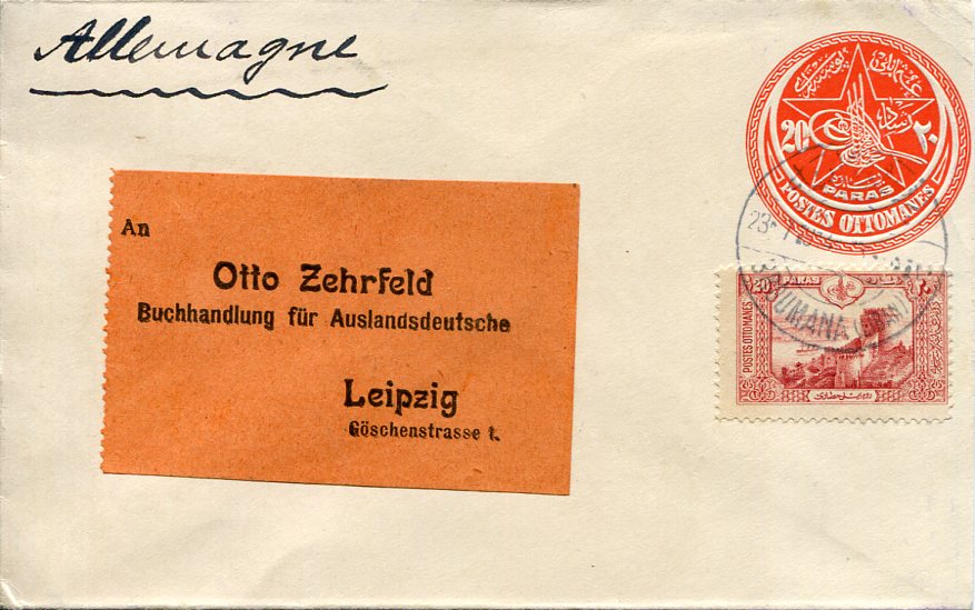 Ottoman Lebanon: 1914 (23 July). 20pa postal stationery envelope additionally franked with 20pa of 1914 pictorial stamp to Leipzig, Germany for single weight one piaster letter rate tied by BRUMANA – BROUMANA (LIBAN) (sandjak Lebanon, A&P type 2, RL #195, RR) datestamp. Reverse no postal markings.