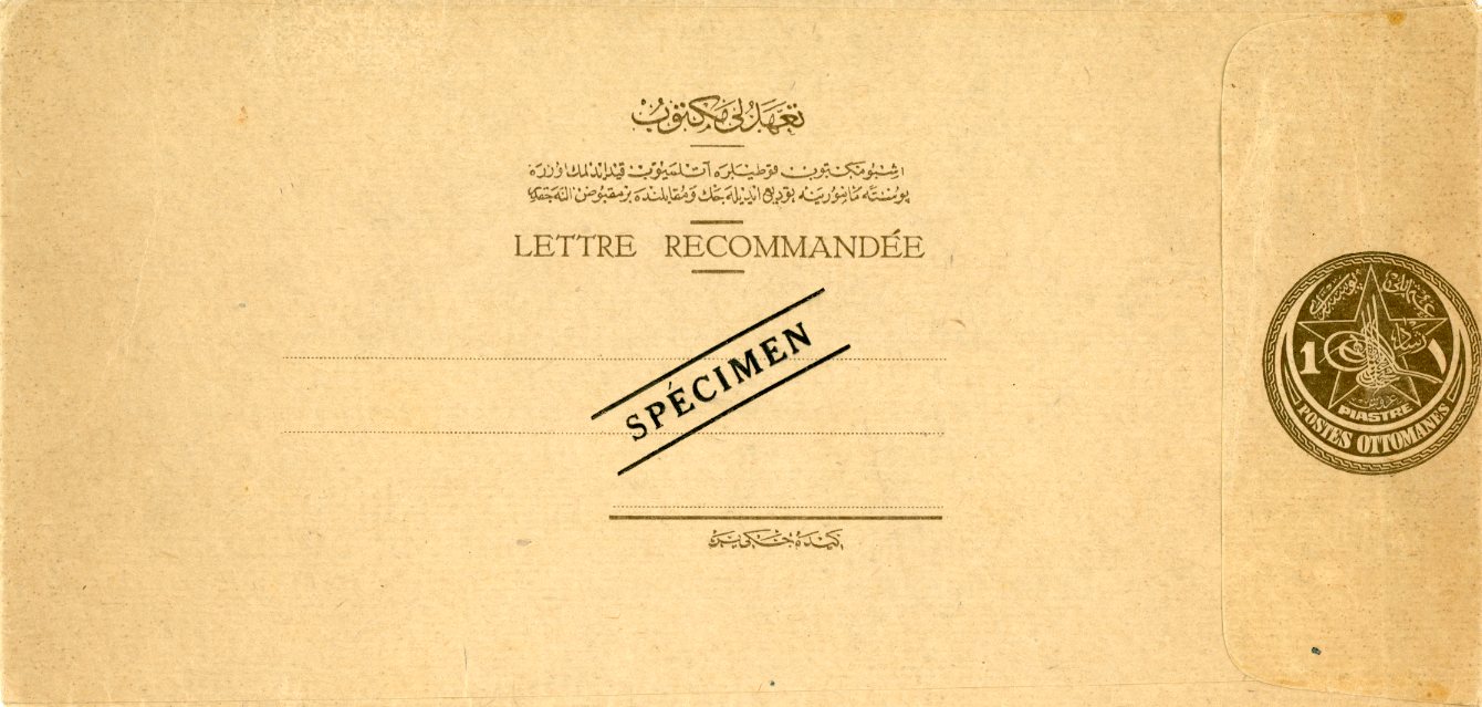 Türkiye: 1914 Bradbury Wilkinson print 1pi SPECIMEN Registered Postal Stationery Envelope (Size H – 225 x 108 mm). Isfila AN123