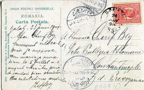 Romania: 1914 (24 June). Postcard titled ‘Galati. Vedere din Str. Domniasca’ (ed. Maier & Stern) to Turkey franked with 10b and tied by Galati datestamp, 26 June Istanbul and next day scarce DERSAADET DUYUN-U UMIMIYE SUBESI – CONSTANTINOPLE DETTE PUBLIQUE (A&P type 1, RR) arrival cds’s.
