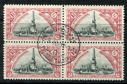 Ottoman Empire: 1914 (14 January). Bradbury Wilkinson print pictorial issue 1 1/2pi Martyrs of Liberty Monument grey and rose block of four struck by Voivoda (Galata) datestamp. Isfila 468, Sg. 506