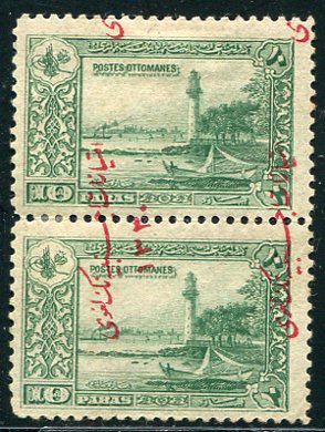 Ottoman Empire: 1914 (1 October). Abrogation of the Capitulations overprinted on 10pa Lighthouse design of 1914 pictorial mint o.g. pair with misplaced vertical overprint variety. Isfila 489SE198 *