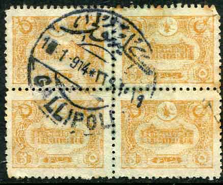 Ottoman Turkey: 1913 New Post Office issue 5pa (isfila 435) block of four struck by 01.01.1914 GELIBOLU – GALLIPOLI (vilayet Edirne, A&P type 7) bilingual datestamp.