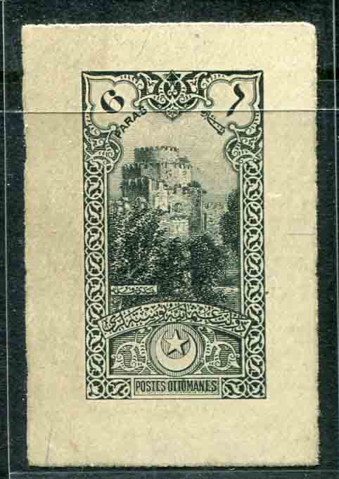 Türkiye: 1914 (14 January). Istanbul Views pictorial commemorative issue 6pi. Seven Towers Castle (Yedikule) design black imperforate essay on ungummed medium white paper. Isfila 464ES220. (*)