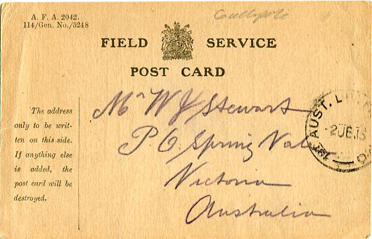 British Army / Australia – Dardanelles Campaign: 1915 (2 December). Pre-printed Field Post Office Card from Gallipoli to Springvale, Victoria struck by 1st AUST. LH FIELD P.O. datestamp. Last mail from Gallipoli was on 12/13 December 1915.