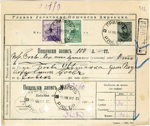 Bulgaria – Occupation of Macedonia: 1918 (18 August). 5st telegraph form additionally franked with 5st. and 50st. to Sliven, Bulgaria tied by PRILEP datestamps. Reverse franked with 10st. revenue stamp tied by 22 August arrival cds.