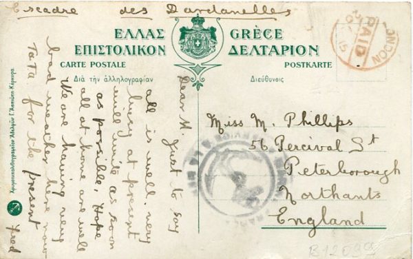 French Levant: 1915 postcard of Greek princesses titled ‘Parc De Decelie Petits Princes’ from Dardanelles to London struck by MARINE FRANCAISE * SERVICE a LA MER anchor handstamp and red London arrival cds.