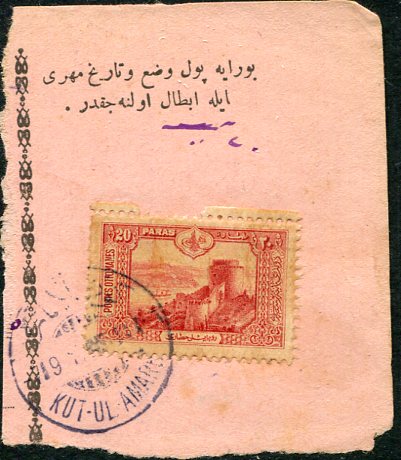 Ottoman Iraq: 1915 (September). Part money order franked with 20pa of 1914 pictorial and tied by KUT ÜLAMARA – KUT-UL-AMARÉ (vilayet Baghdad, A&P type 3, Giray IRQ 141) bi-lingual datestamp.