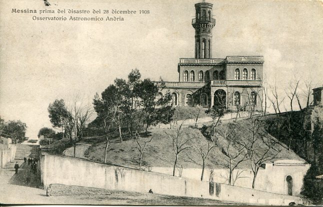 Italian Levant: 1915 (17 October). Postcard of Messina Observatory to Italy from an Italian Navy Water Tanker Aniene struck by TRESOR ET POSTES * 198 (used by French Expeditionary Corps of the Orient at Salonica after 11 October 1915) datestamp CISTERNA ANIENE cachet and two lines BOLOGNA POSTA ESTERA handstamp.