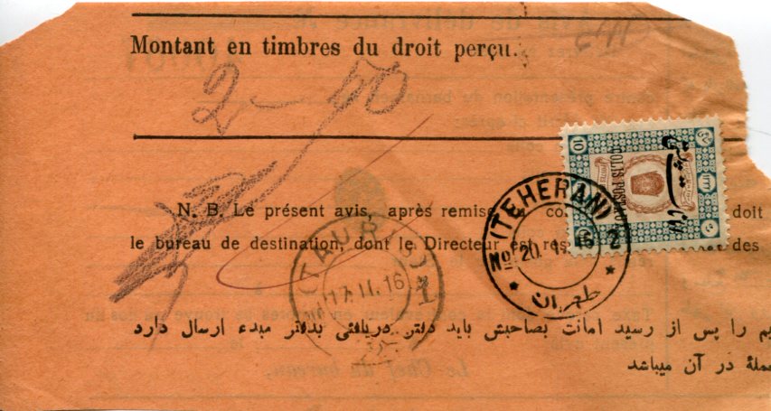 Iran: 1915 Colis Postaux (Parcel Post) overprinted on Coronation issue 10ch on piece with Teheran 20.01.1916 and Tauris 17.02.1916 arrival cds’s.
