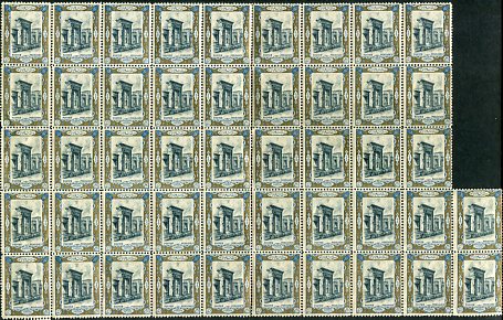 Iran: 1915 (April). Coronation of Ahmad Shah Qajar issue 5t perf. 11 x 11 1/2 unmounted mint block of 47. Few tone spots on reverse and some separation otherwise fine and scarce as multiple. Sc. 577, Sg. 442
