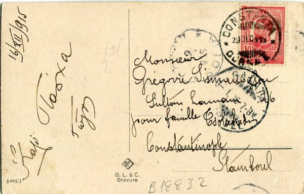 Romania: 1915 (29 December). New Year greetings postcard to Istanbul franked with 10b and tied by Constanta datestamp, 1 January 1916 (19.12.1915) Sofia transit and 3 January Galata arrival cds’s.