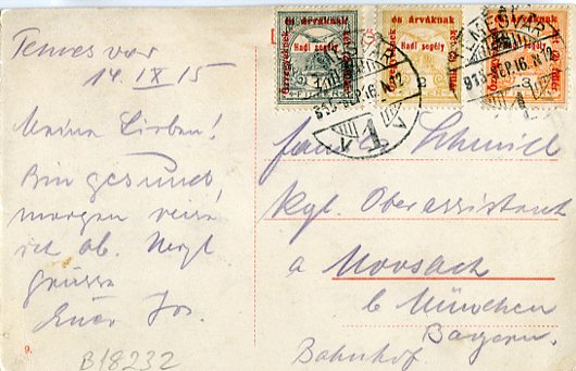 Hungary – Romania: 1915 (16 September). Postcard of Timisoara titled ‘Belvaros. Merczi-utca’ to Munich, Germany franked with 1f, 2f and 3f Kingdom of Hungary war charity stamps tied by TEMESVAR datestamps.