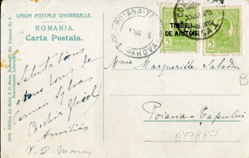 Romania: 1915 (30 July). Postcard of Techirghiol (ed. Maier & Stern) to Poiana franked with 5b and overprinted 5b postal tax tied by Constanta datestamp and 1 August arrival cds.