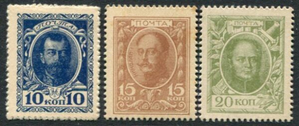 Russia – Imperial: 1915 (October). Currency stamps printed on cards Romanov design set. Mi. Ia,b,c. (*)