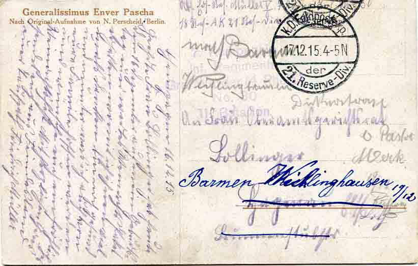 Ottoman: 1915 (17 December). Postcard of Enver Pascha used German military personnel with unit cachets and 21st Reserve Division postmark.