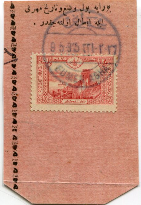 Ottoman Turkey: 20pa of 1914 pictorial stamp on piece struck by ÖMERAĞA – EUMER AGHA (vilayet Alep, A&P type 2, TR #4694, RRR) bilingual datestamp.