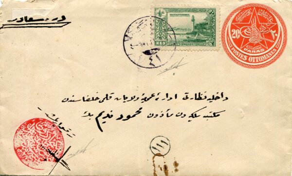 Türkiye – Ottoman Military: 1915 (21 August). 20pa postal stationery cover with part contents additional franked with 10pa for war orphans tax tied by SAHRA POSTASI 41 datestamp and İKİNCİ ORDUYU HÜMAYUN İSTİHBARAT MÜDÜRİYETİ (Second Army Intelligence Directorate) negative seal and on reverse 6 September arrival cds. Letter written by Esat Pasha (a.k.a. Yanyali, later Mehmet East Bülkat). Part letter inscribed Seddülbahir (Cape Helles). FPO 41 used by the Second Army located in Dardanelles at that time.