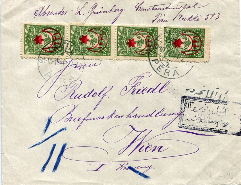 Ottoman Turkey: 1915 (30 October). Censored cover to Vienna franked with strip of four 10pa of 1916 war opt stamps and tied by Pera 4 datestamps and Istanbul 53 censor cachet. Reverse same day Stamboul Deprat cds.
