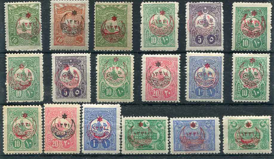 Ottoman: 1915 (30 September). Six pointed small star and crescent overprinted on various Ottoman stamps for War Orphans Tax, mint o.g. complete set of 18. Isfila 566/583