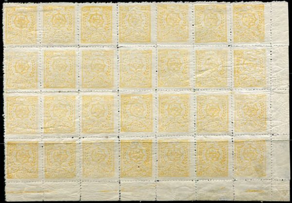 Afghanistan: 1916 (October). Coat of Arms 2a yellow unmounted mint with patchy gum corner marginal block of 28. Top four stamp hinged. Scarce multiple. Sg. 170