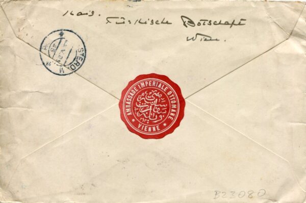 Austria: 1916 Ottoman Embassy imprinted cover to Amsterdam franked with pair of 20h Ferdinand portrait tied by Wien datestamp and arrival cds on reverse as well as AMBASSADE IMPERIALE OTTOMANE * VIENNE * red rosette label.