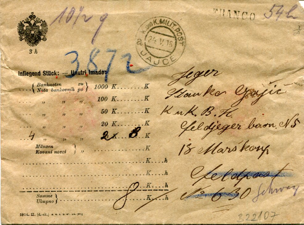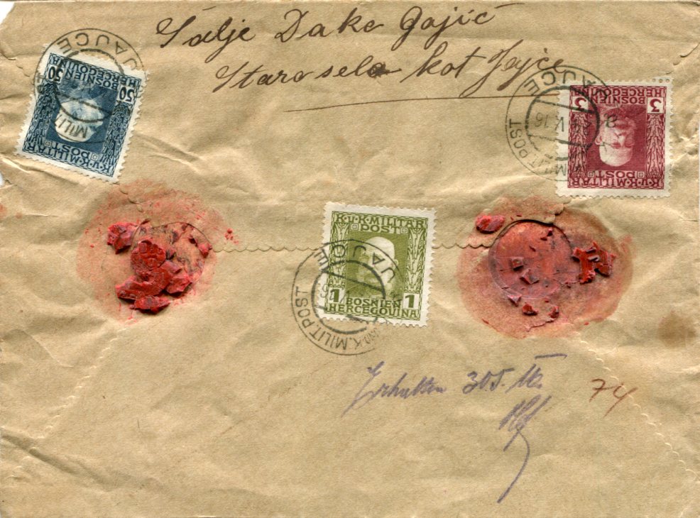Bosnia and Herzegovina: 1916 (24 May). Money Envelope for the sum of 8kr by a soldier serving at Feldpost 630 franked on reverse with 1h, 3h and 50h Francis Joseph I portrait stamps tied by JAJCE datestamps. On front FRANCO handstamp at top right, 10 1/2gr weight and official no. 3872 by crayon. Mi. 64, 66, 77 – Sg. 362, 364, 375