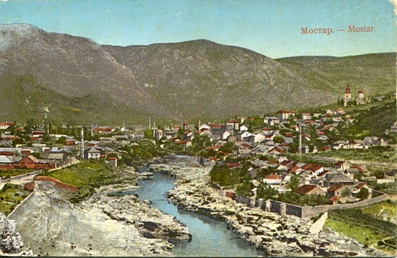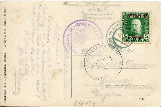 Bosnia and Herzegovina: 1916 (4 January). Postcard of Mostar (ed. I & R Jeremic) franked with 1915. 7h surcharged on 5h tied by Austrian Military Post MOSTAR datestamp and SOSMEZO (today Poiana Sarati, Romania) arrival cds and violet Military Unit handcachet.